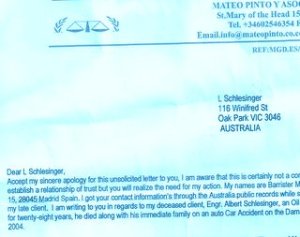 “My name is Barrister Mateo Pinto of St. Mary of the Head 15, 28045, Madrid Spain. I got your contact information through the Australian public records while searching for the last name similar to my late client.”