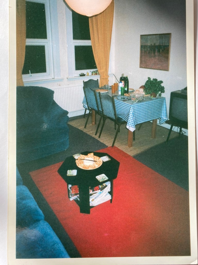 As I remember it, the flat had a long passageway, off which jutted first a tiny toilet to the left and then to the right a large, not too unpleasant living room furnished with a comfy blue couch, red carpet, boxy television with Sky Box on top and small dining table in the far corner.